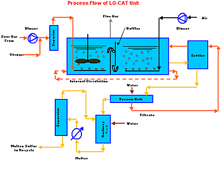 The Lo-Cat II process is an isothermal method for forming elemental sulfur by transferring electrons from sulfide ions to oxygen. The reaction takes place in an aqueous solution containing iron ions (USFilter chose iron over other metal-ion catalysts because it is inexpensive and non-toxic). The basic reactions are an absorption and regeneration phase.