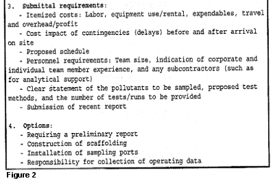 Figure 2 includes a list of elements that should be addressed in a solicitation scope of work. Be prepared to closely investigate the proposal in detail to be assured that your requirements will be fulfilled. Have a clear understanding of the cost implications if the test does not go off on schedule. Make sure you are getting a commitment to test for the pollutants of concern using approved methods.